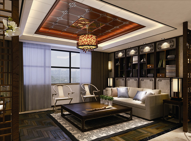 大面積白色的客廳吊頂布局使空間顯得簡約大氣。層層遞進的躍層造型,有助于實現(xiàn)輕松、隨意的生活方式。中央?yún)^(qū)域帶有精美紋飾的板材與燈帶的點綴,增添了空間的美感與情調(diào),又豐富了客廳的藝術(shù)內(nèi)涵。