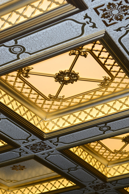 其設(shè)計(jì)理念來源于梵蒂岡的圣彼得大教堂穹窿頂,尤其是其巨大的圓形穹頂脊線有序排布的雕刻,錯(cuò)落排列的方格;而最核心的客廳頂產(chǎn)品設(shè)計(jì)理念則來源于米開朗基羅設(shè)計(jì)的雙重圓頂,在雕刻精美的吊頂板之下設(shè)計(jì)一圈鏤空的光帶,讓光線自由發(fā)散,用光線來烘托板面的精致細(xì)膩,營造如夢(mèng)似幻的空間氛圍。并借鑒其井字結(jié)構(gòu)的裝飾方式,在天花吊頂領(lǐng)域引入腰線裝飾的概念,以腰線做架構(gòu),營造空間氣勢(shì),突顯細(xì)節(jié)的精致與非凡的格調(diào)。