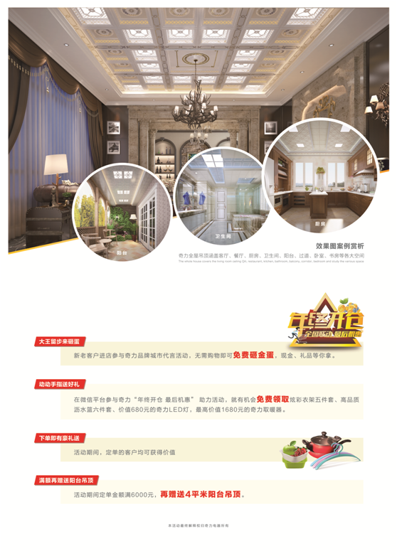 本次活動內(nèi)容豐富,新老客戶進(jìn)店參與奇力品牌城市代言活動,無需購物即可免費(fèi)砸金蛋,現(xiàn)金、禮品等你拿?;顒悠陂g,定單的客戶均可獲得精美禮品一份,驚喜不斷,活動連連,更多的內(nèi)容煩請進(jìn)店咨詢,走過路過奇力吊頂專賣店,一定不要錯過。